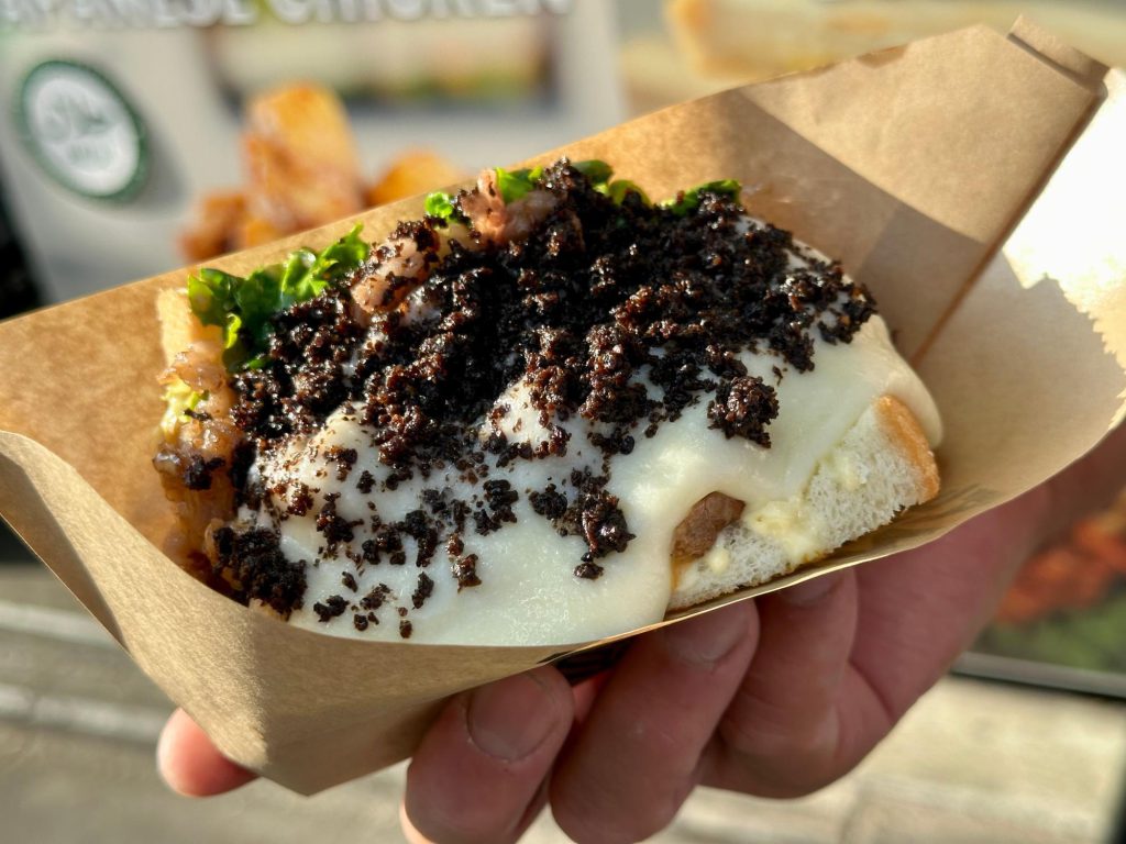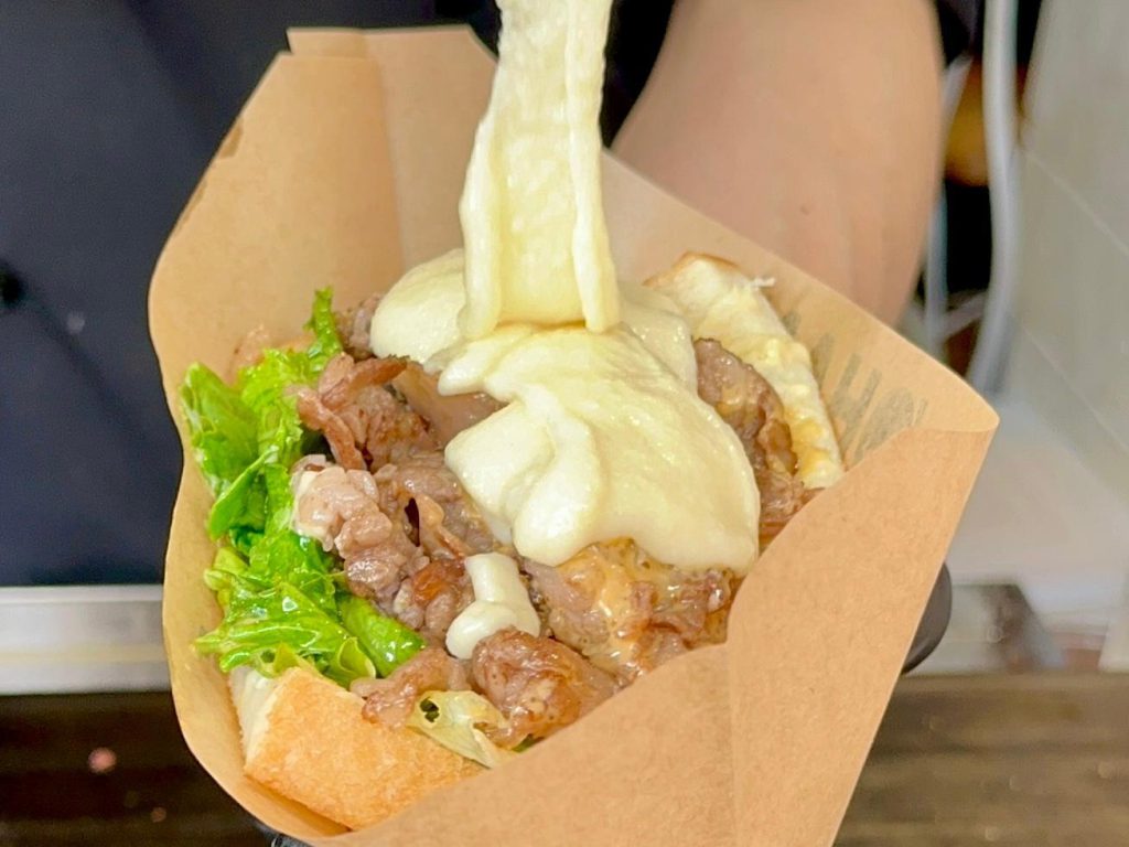 そこに特製の「オハナソース」とたっぷりの黒トリュフを振りかけて完成となるが、お店おすすめの最強トッピングがとろとろととろけるチーズ。こちらもありえないほどのチーズがたっぷりとサンドの上からかけられる。黒毛和牛とトリュフ、そしてチーズの三つが一体になって美味しさが数倍にも膨れ上がっていく。